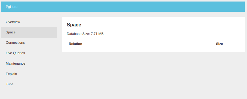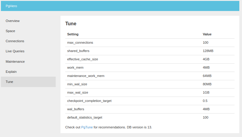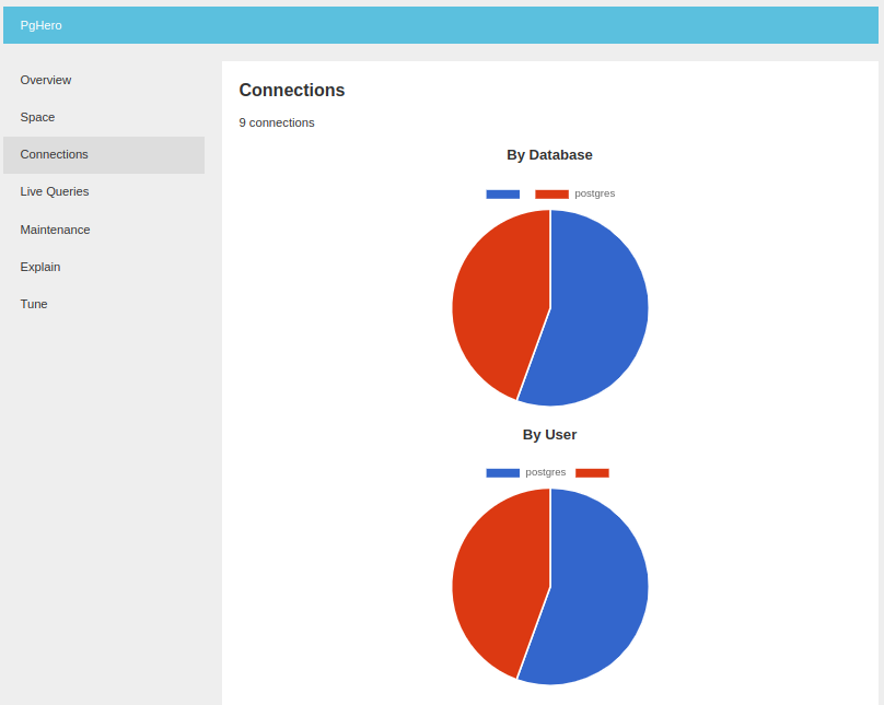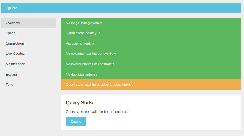 PgHero ofrece un panel navegable para leer las estadísticas de rendimiento, hay una descripción general fácil de interpretar, que brinda el estado de las conexiones, las consultas de larga duración, los índices no válidos, duplicados o sugeridos.