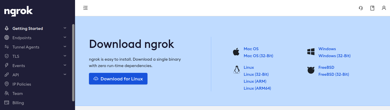 Para ello se debe acceder al sitio https://ngrok.com/ crearse una cuenta e instalar ngrok según el sistema operativo que se tenga, en este caso se muestra los pasos para Linux y Mac