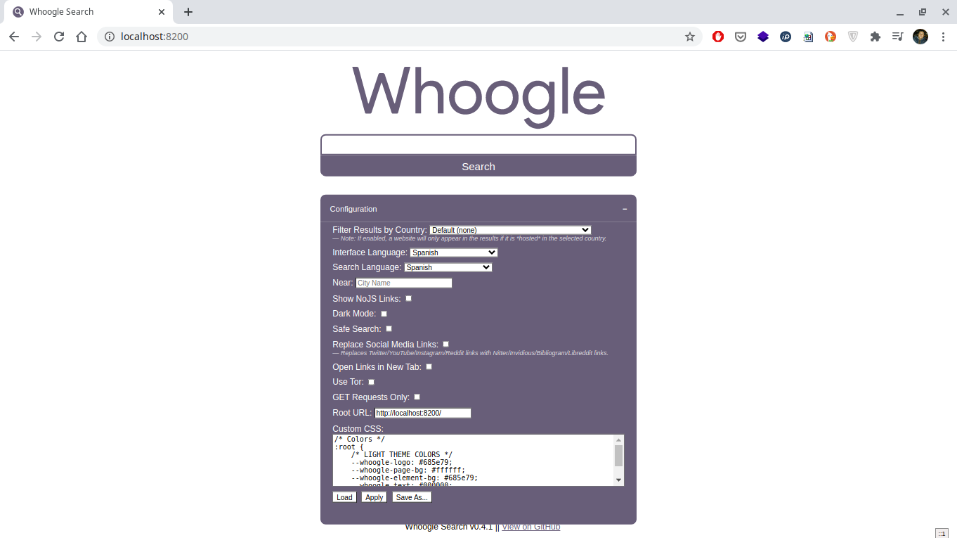 Aparecen algunas datos de configuración, de esta manera los resultados mostrados por whoogle serán mucho mas parecidos a los que se obtienen en google.