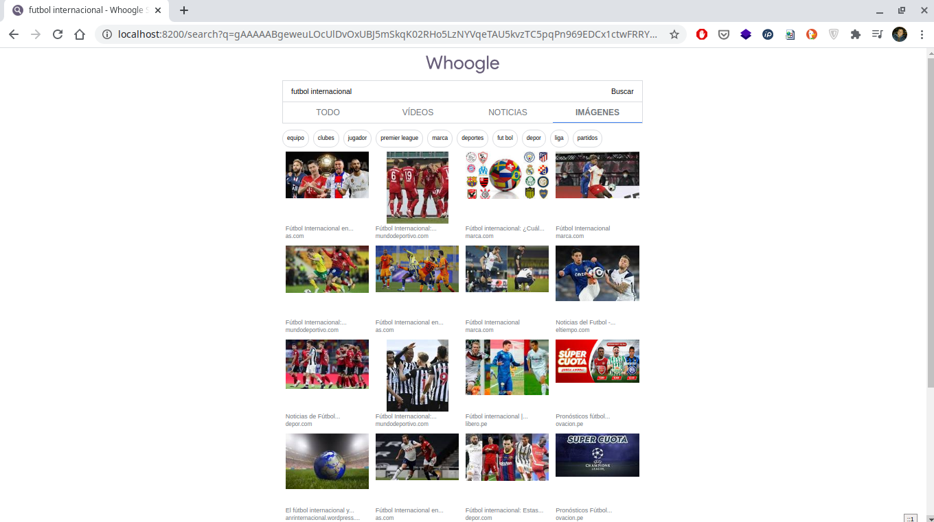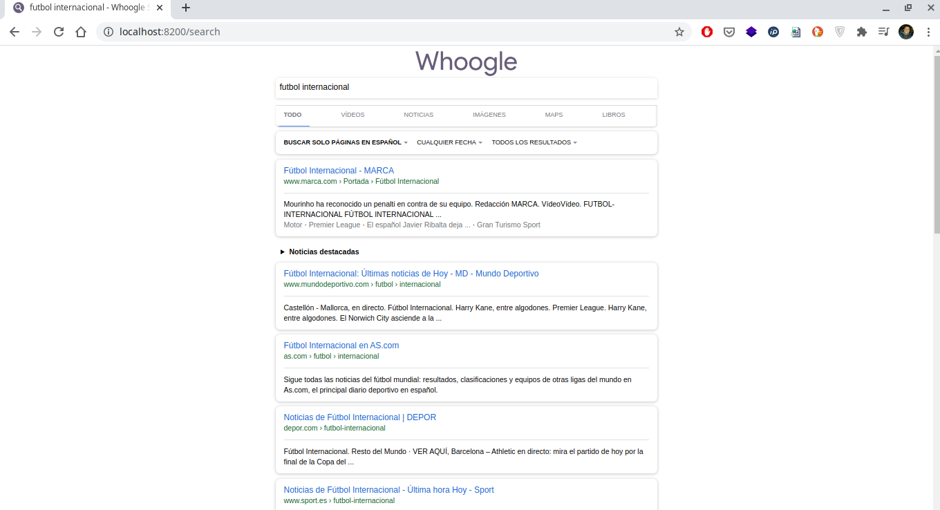 - Una vez aplicados todos los filtros Whoogle nos mostrará los resultados de la búsqueda.