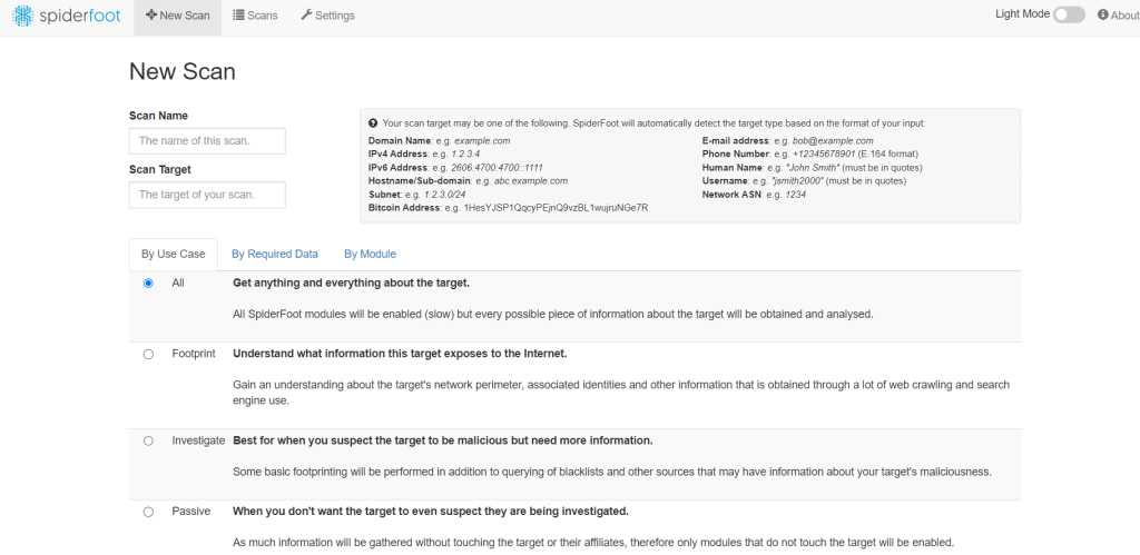 - Automatización y Escaneo Completo: SpiderFoot puede iniciar automáticamente escaneos basados en eventos, lo que permite a los usuarios monitorear continuamente la información de las entidades y recibir actualizaciones cuando se descubra nueva información relevante.