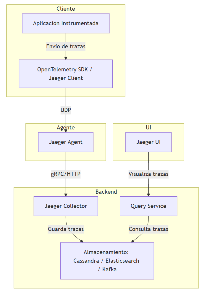 - Agente: Un proceso liviano que recibe datos de las aplicaciones instrumentadas y los envía al colector de Jaeger.